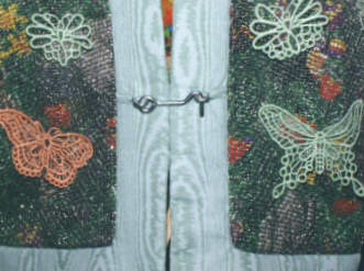 This vest represents a screen-door. The base fabric is overlaid with a silver mesh fabric. The border (reverse facing) is made from a moire printed fabric which has the look of wood-grain. I used fusible fleece to give a little dimension to the border. The closure is a screen-door hook. I made tiny fabric tubes in the border fabric to use a sleeves for the screws which I then sewed onto the border by hand and also stitched the metal eyes to the fabric to keep them in place. Then I stitched lace insects from "Fanciful K-Lace" to the surface of the vest. The "belt" in the back is a spring to give further reference to the screen-door.