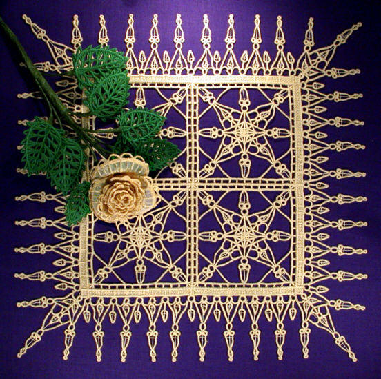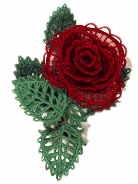 Roses, roses, roses! Decorate with doilies in three shapes, plus freestanding roses --from buds to full-blown beauties. Petals are stitched with organza, while leaves are thread-only K-LaceŽ. All designs in this package are stitched with 50/60 wt. cotton thread. The oval doily (13" x 16") may be made longer by adding to the center. Two edging styles are available for all doilies. The 11" square doily may also be stitched larger or rectangular by adding squares. This collection also contains coordinating versatile flexible edgings. Composite files included for machines with larger hoops.