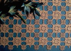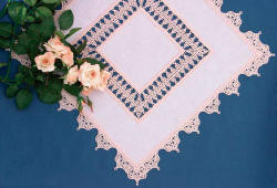 | REBECCA: Instructions are included for the 12.4" x 14.4" centerpiece shown here, but there are many other uses for these elegant designs. Edgings for table linens or garments are possible, as well as placemats, coasters, tablecloths and other lace projects. |