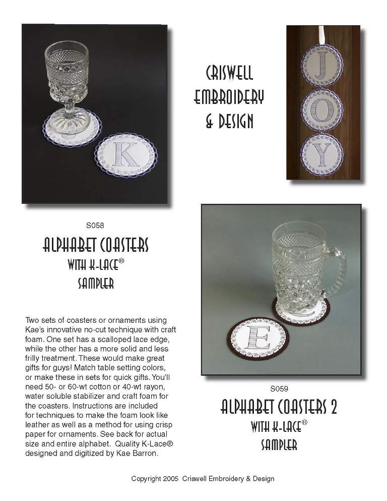 S058 Alphabet Coasters with K-Lace Sampler Coasters with monograms and scalloped lace edgings are stitched